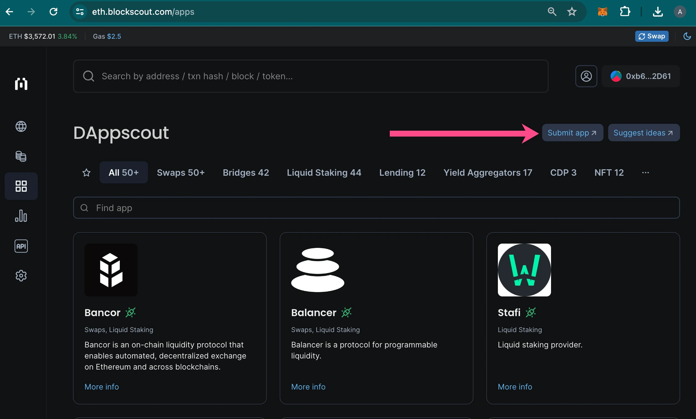 Dappscout marketplace provides additional security and peace of mind when interacting with various Dapps on a chain. Rather than accessing potentially fake links, scam sites or compromised interfaces, all Dapps in Blockscout are vetted and added by the curation team. Dappscout Dapps are safe and secure for users.Dappscout Submissions