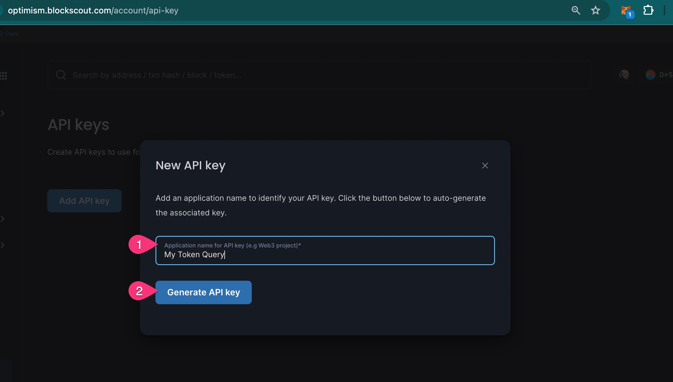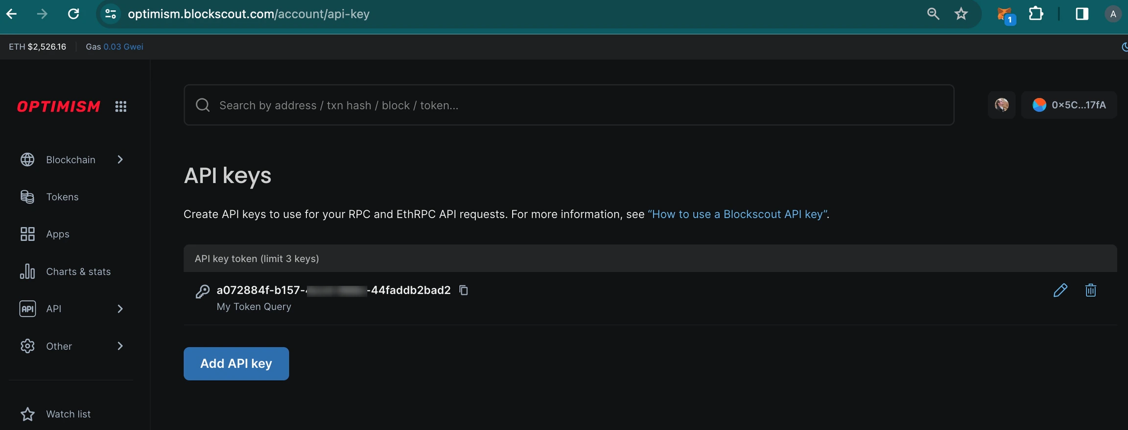 Add the following to the end of a query to use your API key: &apikey=your-api-key For example, a query to get more info on USDT on Optimism with the API key fdbfa288-1695-454e-a369-4501253a120would be formatted as follows: https://optimism.blockscout.com/api?module=token&action=getToken&contractaddress=0x94b008aA00579c1307B0EF2c499aD98a8ce58e58&apikey=fdbfa288-1695-454e-a369-4501253a120