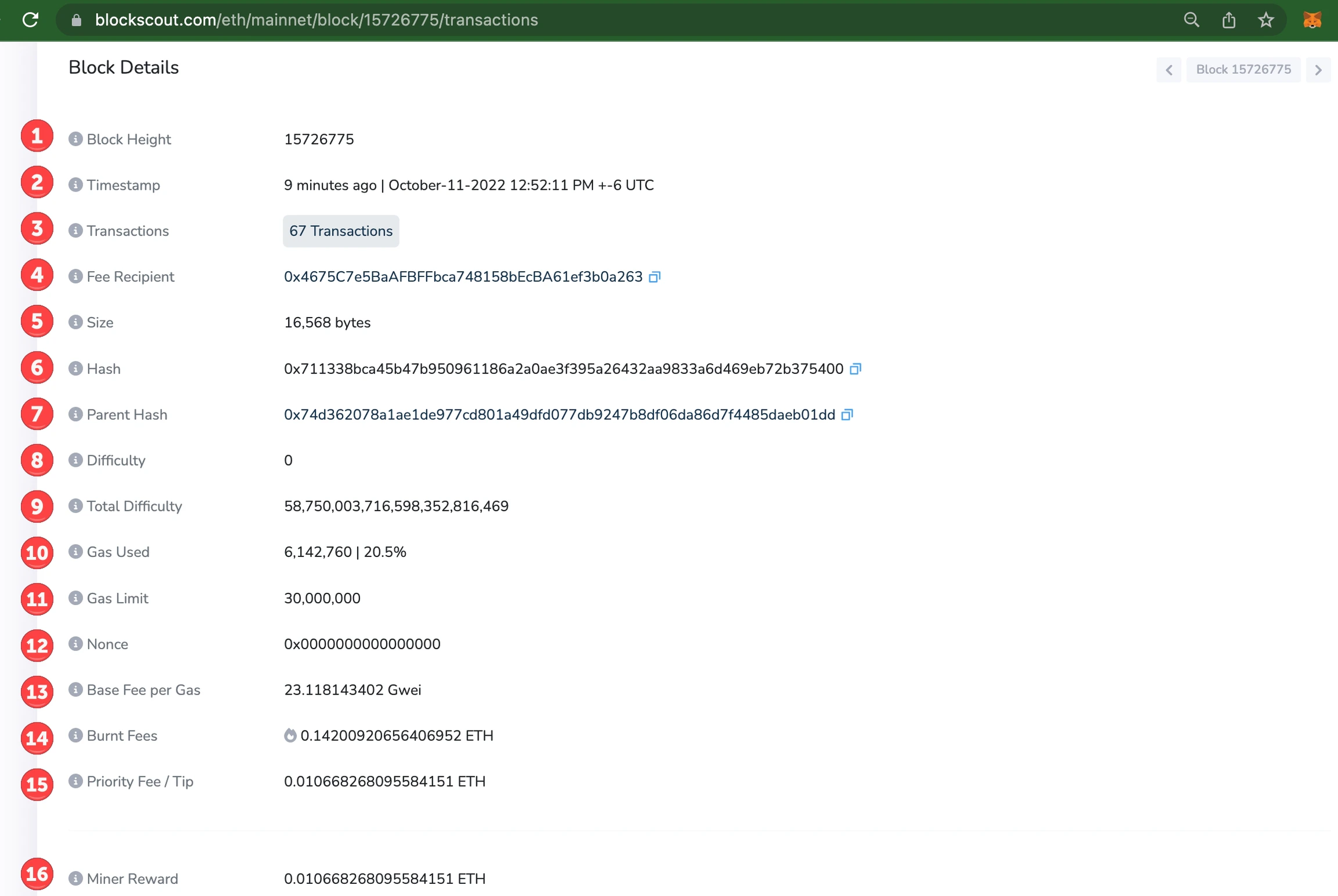 1. Block Height: Also known as block number, shows the position of the block on the chain.