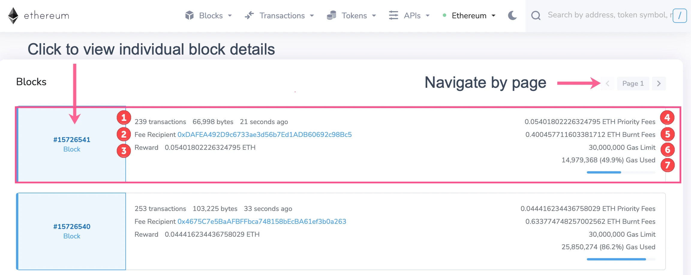 The view all blocks page shows updated details from the most recent blocks. Use the page arrows to navigate