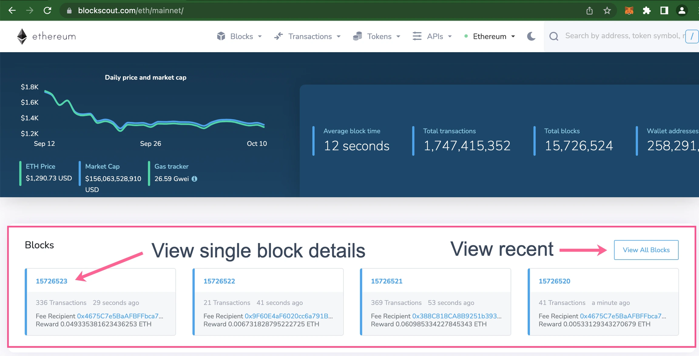 Blocks update on the homepage as they are created with basic information including block number (block height), number of transactions in the block, and time since the block was created. Click on a specific block number for information about that block, or View All Blocks for a more detailed overview of recent blocks. The all blocks page can also be accessed from the top menu.
